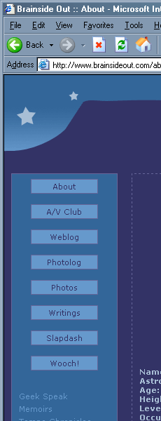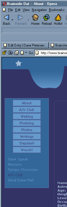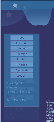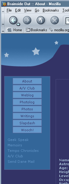 Disregard the background image, as its positioning is determined by the size of the browser window and has nothing to do with the inconsistencies we’re working with here. IE gets the top and left spacing of the navigation window, right down to the pixel. The width of the navigation window is also pixel-perfect. IE is playing a funny, funny game with margins between the buttons, and I’ll need to probe my code a bit for to figure out what’s going on in there. This makes me cranky.
